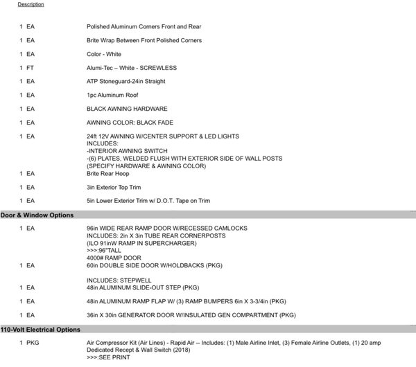 Brand new 28’ Aluminum RC Stacker, this unit is loaded up with most everything such as .080 screwless exterior aluminum cabinets, aluminum built in toolbox, closet, electric pkg with rv power center and white/blue LED lighting, awning, and so so much more. Build sheets in pictures so you can see everything it has. Get it before it’s gone as there will never be another one at this price as pre-price increase.